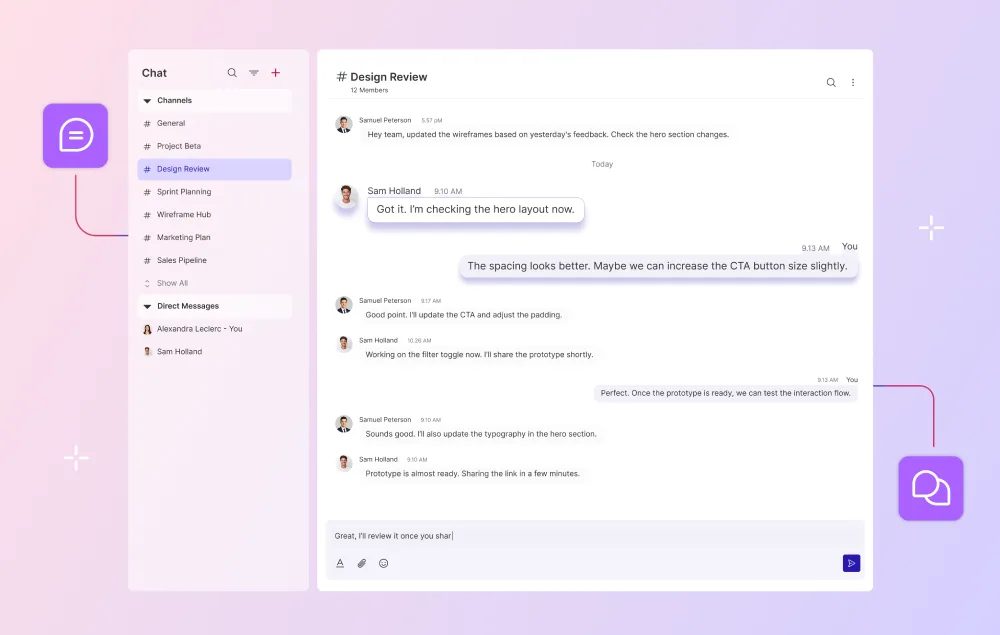 Sometimes you just need a quick one-to-one message. Other times, the whole team needs to be in the loop. With Direct Messages and Channels in Orta, you can chat instantly, share files, @mention teammates, react with emojis, edit messages, and even keep a Self Chat for quick notes. No tab switching, no lost conversations – just faster, more natural teamwork.